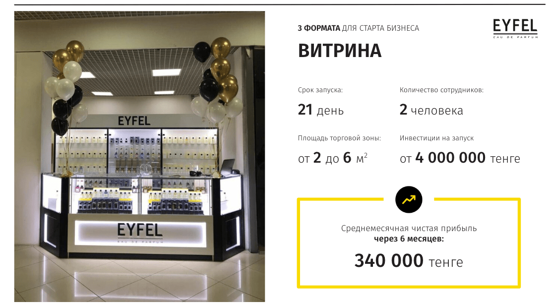 Заключив договор с Eyfel, вы становитесь владельцем парфюмерного бутика и через 21 день выходите на первый чек